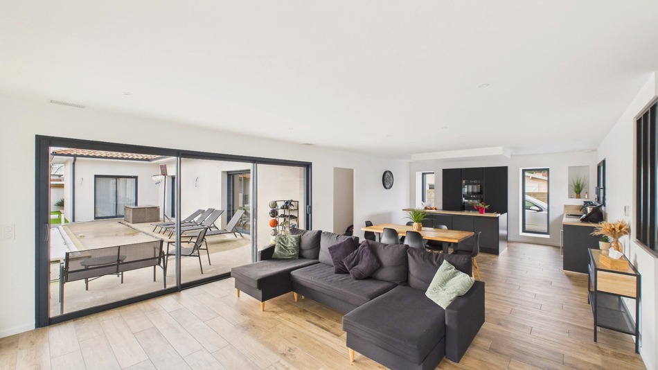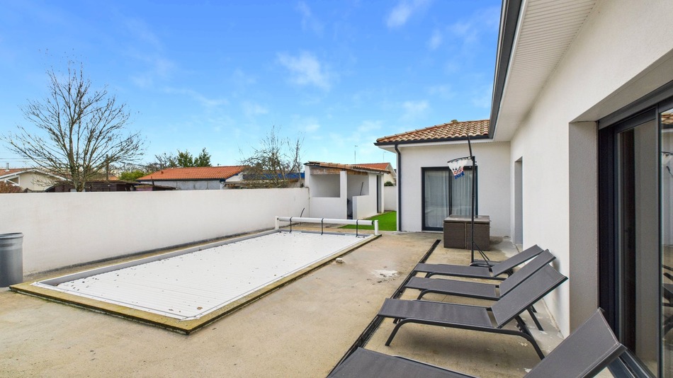 Hidden from view in a sought-after residential area, this recently built (2022) contemporary villa embodies modern comfort, high-quality finishes, and the relaxed lifestyle of the Landes region. Offering 160 sq m of living space, the house is organized around a magnificent 53 sq m living room, bathed in natural light thanks to its large bay windows and opening onto a high-end American-style kitchen, designed for entertaining. The sleeping area comprises four bedrooms, including a master suite, a bathroom with a walk-in shower, and perfectly balanced proportions. A detached garage and a laundry room complete the property. Outside, the charm is immediate: a saltwater swimming pool, a summer kitchen, a pétanque court, a utility room, a private garden with no overlooking neighbors, and an ideal southeast exposure to fully enjoy the sunshine. A unique, turnkey property to discover without delay!
