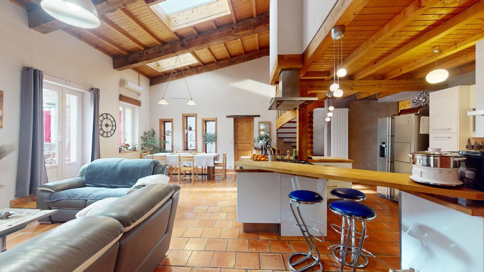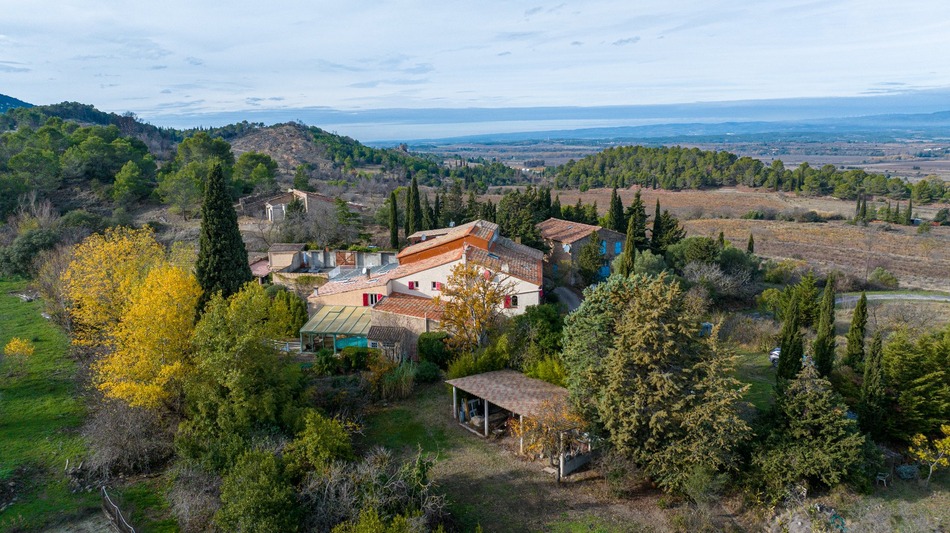 Located in a magnificent environment surrounded by scrubland and at the foot of the Alaric mountain, 20 minutes south-east of Carcassonne (UNESCO World Heritage Site), I invite you to discover this restored property offering living spaces generous and warm. The property today offers a large main house (approximately 480 sqm of living space) as well as 2 gîtes (which can communicate with the house). On the garden level, large living room opening onto the kitchen (56 sqm) and the veranda housing the heated swimming pool, a reception room for celebrating (118 sqm), a patio, 2 bedrooms and two terraces. Upstairs, a very large living room of approximately 112 sqm opening onto a solarium terrace with views of the scrubland and the mountains and three bedrooms including a master suite... enough to think big! To consider a tourist reception project or expand the living spaces, the rest of the house also includes a communicating apartment, with kitchen, living room, 2 bedrooms and terrace as well as a studio, both benefiting from independent access. Want to welcome horses? You have a quarry and 5 boxes. On approximately 7.7 hectares in a dominant position, in a small hamlet of 3 houses, between vineyards and scrubland, approximately 45 minutes from Gruissan and the beaches of the Mediterranean: a magical place to discover.
