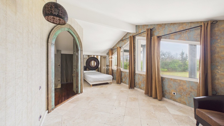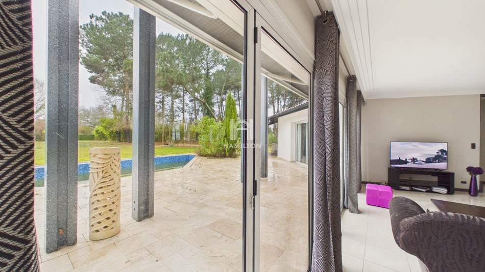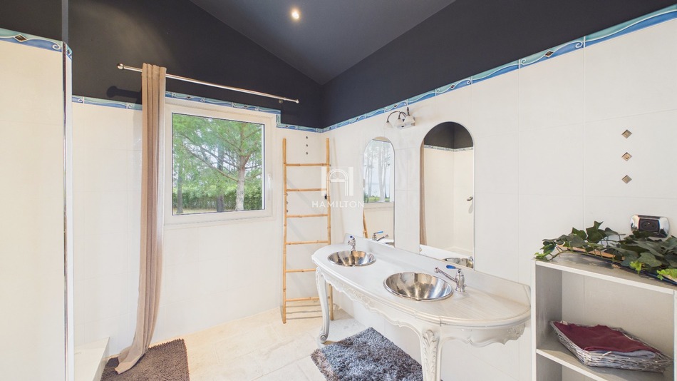 Sanguinet Une propriété rare, entre lac et lumière Il existe des lieux où la nature impose le silence, où la vue s'ouvre sur l'eau, les pins et le ciel. Cette villa en fait partie. Implantée en position privilégiée, adjacente au lac de Biscarrosse, sur près d'un hectare et demi de terrain, cette propriété offre un cadre de vie confidentiel, à quelques pas seulement des plages. L'architecture s'articule autour des volumes et de la transparence. Les lignes sont ouvertes, les perspectives longues, la lumière omniprésente. Les espaces: Le cur de la maison s'articule sur plus de 75 m² d'espace de vie avec sa cuisine ouverte. De larges baies vitrées prolongent naturellement le séjour vers la terrasse et la piscine, dans une continuité fluide entre intérieur et extérieur. La villa propose 7 pièces dont 4 chambres, avec deux suites en rez-de-chaussée permettant une vie de plain-pied tournée vers le jardin, et deux chambres supplémentaires à l'étage offrant des vues dégagées sur la nature environnante. Chaque ouverture cadre le paysage et chaque espace dialogue avec l'extérieur. Un art de vivre. À l'abri des regards, la terrasse s'étend face au parc arboré. Piscine, jacuzzi sous pergola, larges espaces de détente : ici, tout est pensé pour profiter du lac et de la douceur landaise en toute intimité. La propriété est entièrement clôturée et bénéficie d'un grand double garage. Un environnement préservé, une vue remarquable, un accès direct aux plages du lac à pied. Le positionnement: Une villa unique sur Sanguinet, offrant une relation privilégiée au lac de Biscarrosse. Un bien destiné à ceux qui recherchent un lieu rare, où l'architecture contemporaine rencontre la nature. Visite virtuelle disponible et dossier sur demande.