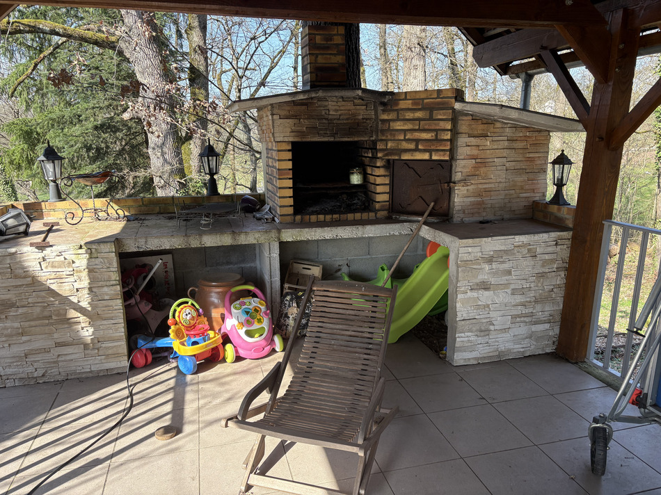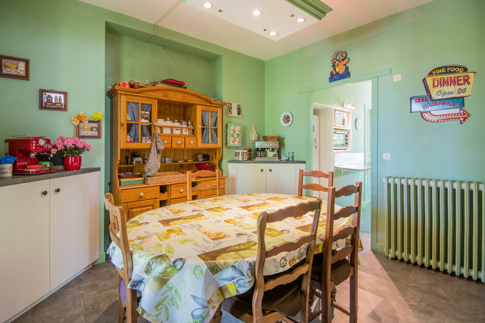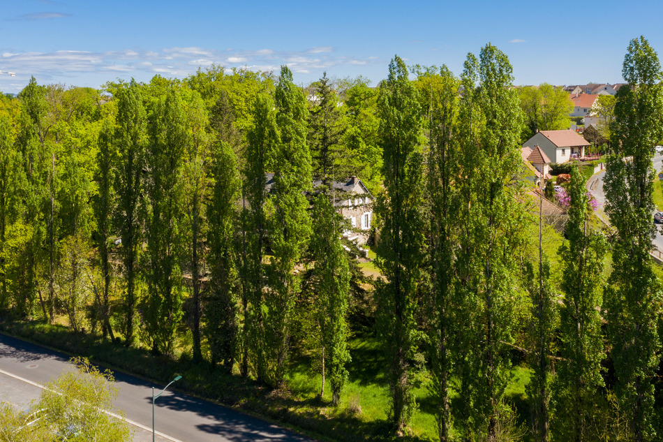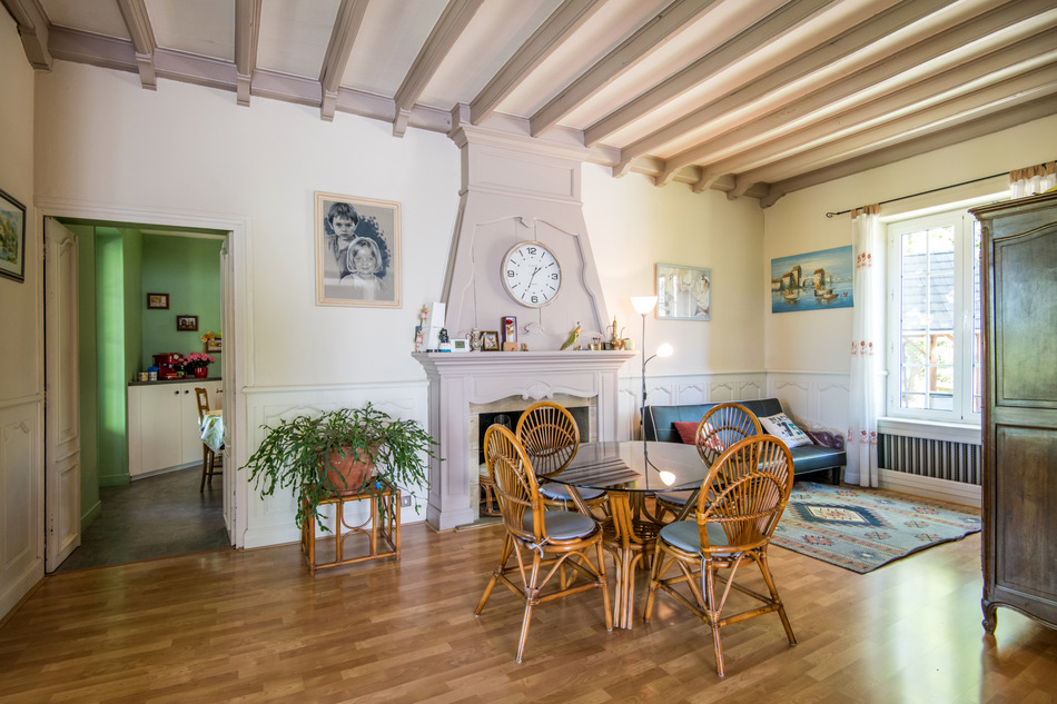 On the outskirts of Brive-la-Gaillarde, in the sought-after area of Saint-Pantaleon-de-Larche, this elegant stone bourgeois residence, dating from 1945, embodies the timeless charm of character properties. With 218 m² of living space, the house captivates with its generous proportions and the quality of its renovation. The heart of the property is undoubtedly its exceptional 80 m² living room, a rare reception space of remarkable proportions. This majestic room is enhanced by two period fireplaces. The first, authentic and elegant, is highlighted by exposed timber framing and superb wooden moldings, affirming the noble and welcoming character of the space. The second houses an integrated wood-burning stove, clad in stone, whose aesthetic perfectly respects the volumes and architectural authenticity of the room, while providing modern comfort. The property creates a unique atmosphere, blending old-world charm, architectural character, and conviviality. It also features four bedrooms, including a spacious master bedroom of over 24 sq m. A magnificent 45 sq m mezzanine, boasting high ceilings with exposed beams and a large skylight bathed in natural light, offers an ideal space for a relaxing lounge, a playroom, or an inspiring office. A 45 sq m garage and a separate, insulated, and tiled workshop complete the property. Set within approximately 4,200 sq m of wooded grounds, with covered terraces, a traditional oven, and a barbecue area, this property perfectly combines the art of living, authenticity, and immediate proximity to amenities. A rare residence, ideal for those who appreciate exceptional space and distinctive character.