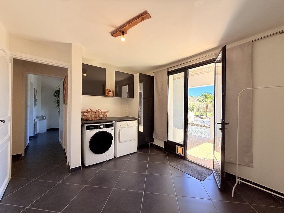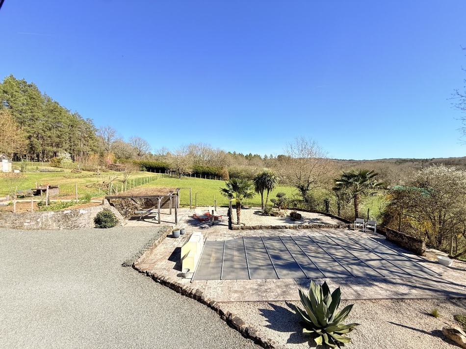 Maison d'architecte récenteOn the edge of a village with amenities, at the end of a quiet cul-de-sac and bordering woodland, this recent property (2010) immediately stands out for its refined architecture, natural light and impeccable condition. From the moment you enter, the house reveals a thoughtfully designed layout, offering both comfort and fluid living, set within an exceptional natural environment with direct access to walking and cycling trails. The main living level features a superb, light-filled open-plan space combining lounge, dining area and a fully equipped kitchen. Large openings lead onto a spacious balcony of over 30 m², offering uninterrupted views over the surrounding countryside — a true extension of the living space. On the same level, a beautifully finished bathroom with bathtub and WC adds a real sense of everyday comfort. The property offers four bedrooms, including one with a private en-suite bathroom, as well as a third independent bathroom, and a utility room. Two covered terraces, accessible from one of the bedrooms and from the utility room, complete the layout. Technical features are of high quality: wooden double-glazed windows, fibre internet, pellet stove in the main living area, and modern electric radiators. Energy consumption remains particularly efficient (DPE B,approx. €90/month). A key additional feature is the independent guest house of approx. 35 m² over two levels, including a shower room and WC, located near the swimming pool. Ideal for hosting family and friends in complete privacy, or for use as a studio or high-end pool house. Outside, the fully enclosed plot of 3,895 m² is well structured and easy to maintain, with a vegetable garden, garden sheds, meadow area and carport. A rare opportunity in the area, combining modern comfort, quality finishes and a privileged natural setting — perfectly suited as a primary or secondary residence.