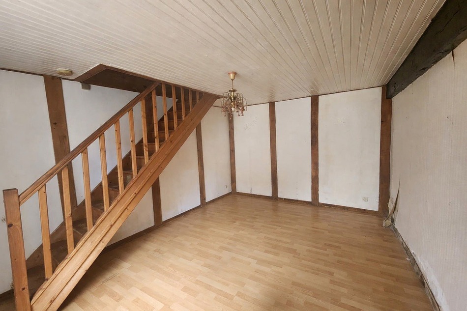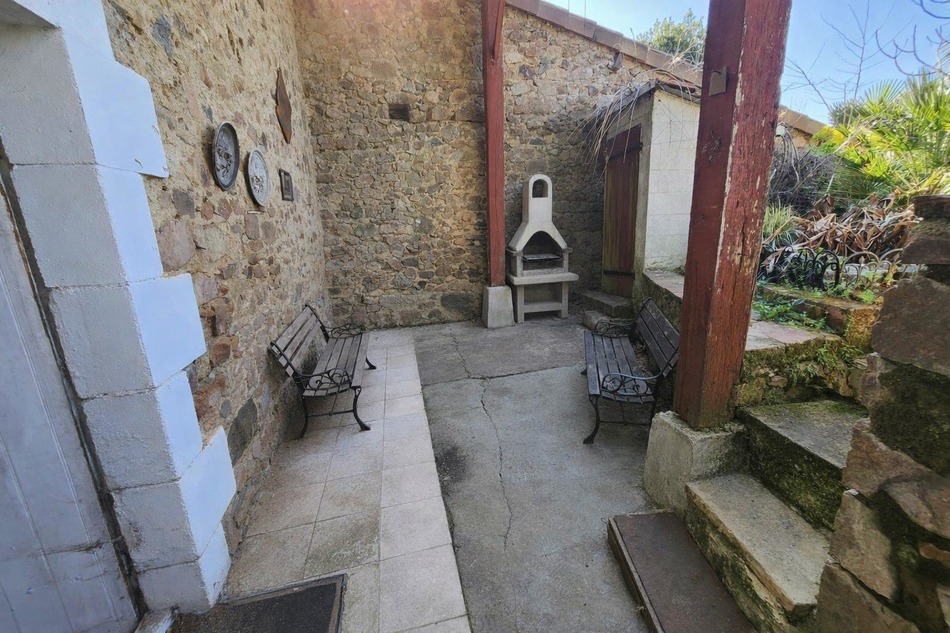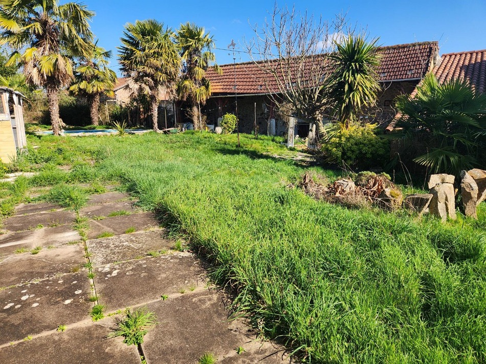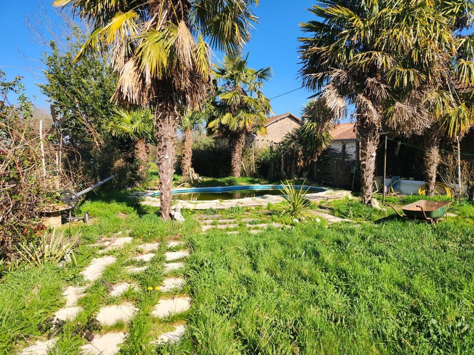 Clare Rogers, in Chabrac, in a hamlet, presents a fabulous renovation project, 3/4 bedroom house with private garden with swimming pool and separate garden, parking. This is a traditional charentaise farmhouse property. As you enter the house you enter into the kitchen with tiled floor, some kitchen units, and traditional fireplace. There are two further rooms leading of the kitchen, with laminate flooring, shower room and another small room with meter. Upstairs is a long corridor, three large bedrooms, one with a old leak (damp stains) on the wall but repaired. There is a large family bathroom also. As you go outside from the kitchen farmhouse door, you walk out to a covered terrasse with barbecue area, a well and a shed, lovely for entertaining, then up the steps to the garden with grassed area, palm trees and inground pool, a feeling of being on holiday all year long, ideal also if you want a small vegatable patch, or chickens. Opposite the house is a large barn (70m2) and a parking area by the side of the house with a gate straight into the garden.This house is dated and is in need of updating, probably a change of fosse septic. 10 minutes from Confolens, 15 minutes from Saint Junien approximately, close to Limoges airport and city with TGV. Fabulous chance.