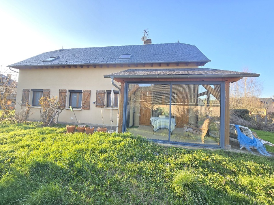 Located at the end of a cul-de-sac in a very quiet residential area, this beautiful 138 m² house is currently divided into two apartments, one on each floor. Built in 2005 using traditional methods, it sits on a flat, enclosed, and landscaped plot of approximately 850 m². It includes a wooden garden shed and a garage large enough for several vehicles (car, boat, jet ski, etc.). A primary school and shops are located nearby. The property is 6 km from Lake Pareloup with its beach and marina, 28 km from Rodez, and 42 km from the A75 motorway. The ground floor entrance is accessed via the veranda at the front of the house, a perfect place to relax. The veranda is adjacent to the living/dining room, which is itself connected to a separate, fully equipped kitchen. Note that it is possible to remove the partition wall separating these two spaces to create an open-plan living area. The hallway then leads to the two bedrooms and the shower room. A separate toilet and a laundry/storage room complete this level. From a door in this apartment, or via the independent garage, a staircase leads to the upper floor, where you'll discover a beautiful open-plan living area under the eaves, showcasing the charm of traditional timber framing. Two bedrooms, with the possibility of creating a third, and a spacious shower room with a toilet complete this property. Outside, a paved driveway leads to the garage, and a vegetable garden has been created on the rear gable end, providing a lovely space for children or pets. Ideal as a primary or secondary residence, perfect for bringing together two generations of the same family while maintaining their independence, for rental investment, for living in one apartment and renting the other out year-round or seasonally, or simply for creating a single home... come and discover this property which offers wonderful possibilities and requires only minor renovations on the ground floor. You can move in immediately, and once personalized, you'll be completely won over by your purchase! Technical specifications: House built in 2005 with concrete blocks, rendered finish, traditional oak frame, poplar sheathing, slate roof, double-glazed wooden windows, wooden shutters + 2020 electric aluminum roller shutters, 10 cm of fiberglass insulation in the walls and 30 cm in the roof, oil-fired boiler with aluminum radiators and hot water production, compliant electrical wiring, connected to mains drainage. Information on the risks to which this property is exposed is available on the Georisques website: www.georisques.gouv.fr