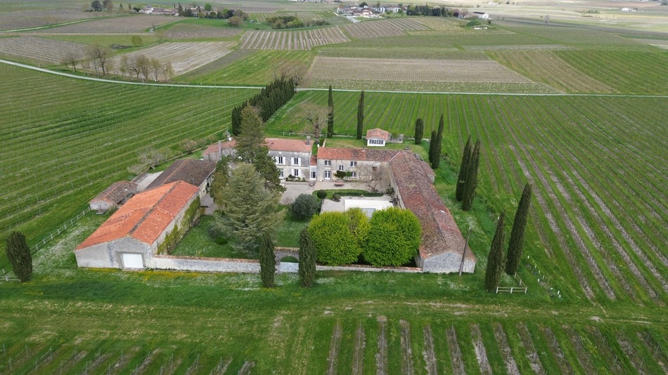Set amidst the prestigious vineyards of Grande Champagne, this characterful property enjoys an exceptional setting, surrounded by rolling vines as far as the eye can see, offering a rare sense of immersion in one of the most sought-after terroirs of the Charente. Accessed via an elegant driveway lined with tall cedar trees, the property immediately evokes a refined, almost Tuscan atmosphere. Sheltered from all views, the estate is arranged around a spacious inner courtyard with swimming pool a true private haven with uninterrupted views over the surrounding vineyards. Offering approximately 400 m² of living space on a plot of 6,400 m², the property provides a highly versatile layout: a main house with 3 bedrooms and generous living areas, including a lounge with fireplace and insert, as well as a kitchen with open fireplace. a first guest house with 4 bedrooms a second, more intimate guest house with 1 bedroom This configuration allows for comfortable family living, entertaining guests, or the development of a hospitality activity in an exceptional setting. The outbuildings, arranged around the courtyard, contribute significantly to the authentic character of the property and provide practical spaces for storage, workshop use or outdoor living, further enhancing the sense of privacy and tranquillity. A rare opportunity defined by its unique location, complete privacy and timeless charm a true lifestyle property in the heart of the vineyards.
