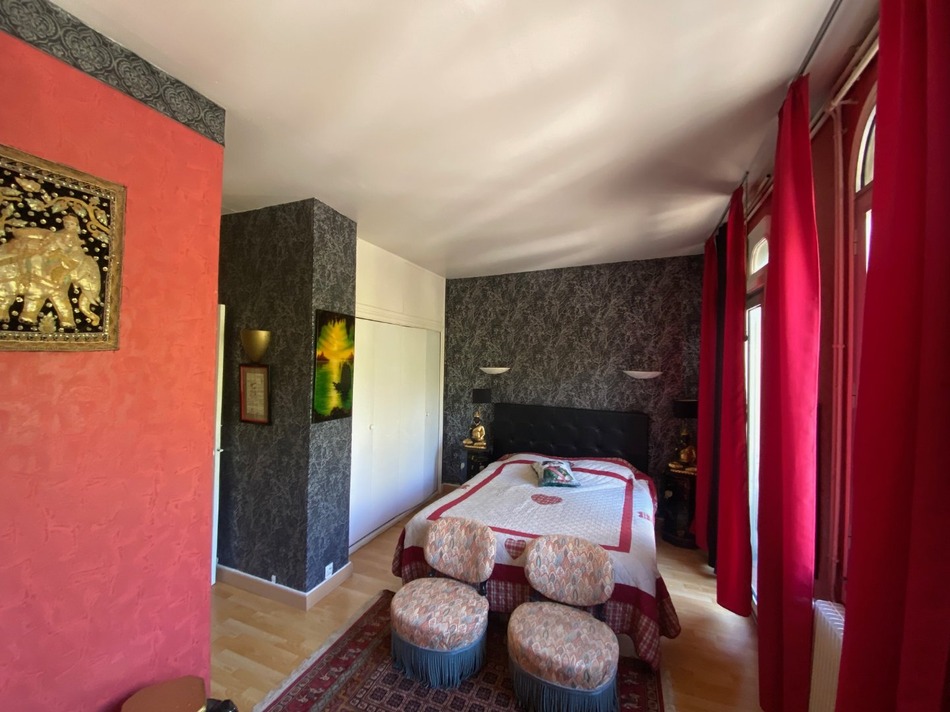 Discover this exceptional duplex of approximately 240m², comprising 6 rooms, including 4 bedrooms (3 suites with shower rooms and bathrooms), a spacious living/dining room of approximately 48m² with a skylight, and an open-plan, fitted and equipped kitchen. A balcony overlooks the Bastide district. Located in the city center, this elegant apartment with its high ceilings and views of the medieval citadel is situated in one of Carcassonne's most beautiful buildings. Typical of late 19th-century urban architecture, it transitions from Neo-Renaissance to Flamboyant Gothic. Its attic, the building's crowning feature, showcases a series of oculi (small circular windows) set within a richly decorated frieze adorned with sculpted motifs, characteristic of the Italian Renaissance, reinterpreted in the 19th century. On the second floor of the building, we also find mullioned windows with their slender columns and segmental arches. Returning to the apartment's layout, there is an entrance hall leading to the living areas, the staircase to the second floor, a storage room (formerly a photographer's darkroom), a laundry room, and three toilets. Each bedroom/suite is equipped with built-in wardrobes. Part of a 17-unit condominium, five of which are residential, the property includes a private garage and two cellars. Individual gas heating with relatively recent boilers (two years old) and air conditioning ensure optimal comfort. The apartment is accessible by stairs or elevator. Floor plans are available upon request.