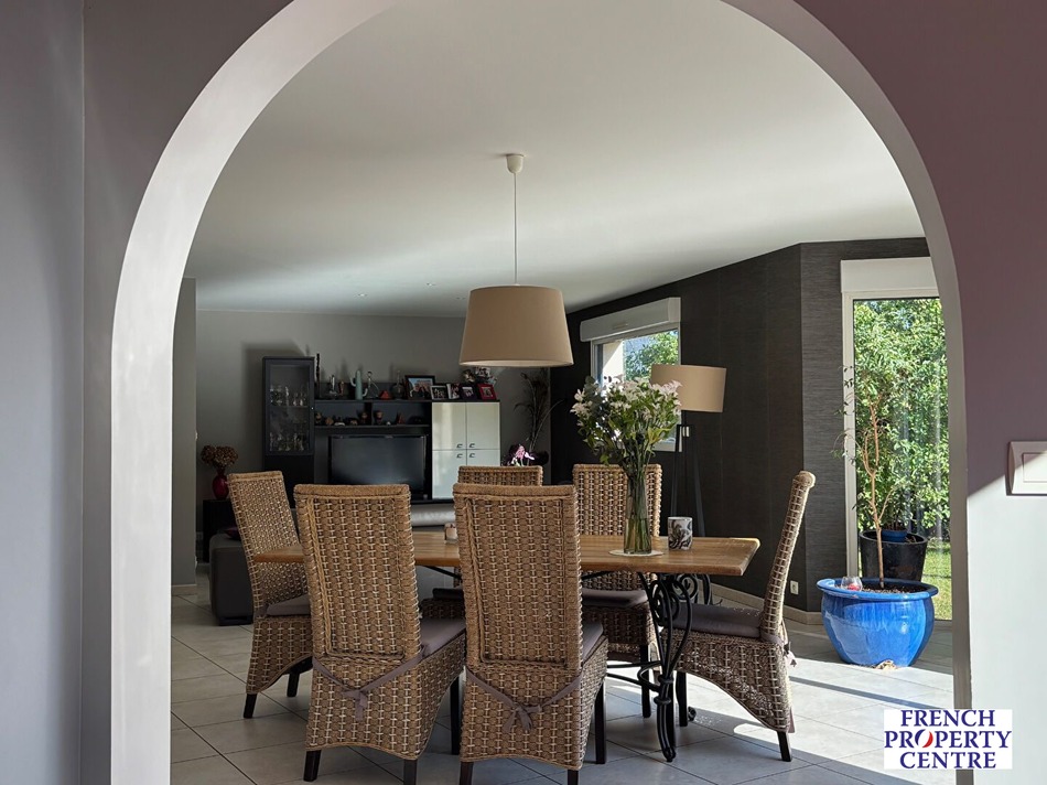 Château-Gontier sur Mayenne, située dans un quartier résidentiel calme, très agréable maison contemporaine de 2006 qui allie modernité et confort, très lumineuse, offrant une vie de plain pied comprenant un spacieux hall d'entrée, cuisine semi ouverte sur séjour salon d'environ 60 m² donnant accès sur terrasse et jardin, une suite parentale (salle d'eau et dressing), une chambre et sa salle d'eau, toilettes, cellier.