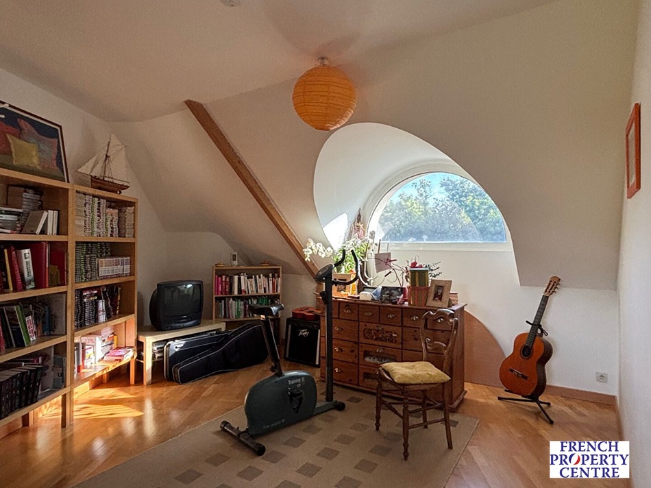 A l'étage, une mezzanine, trois chambres, salle de bains, toilettes. Un grenier en attente d'aménagement. Grand garage.