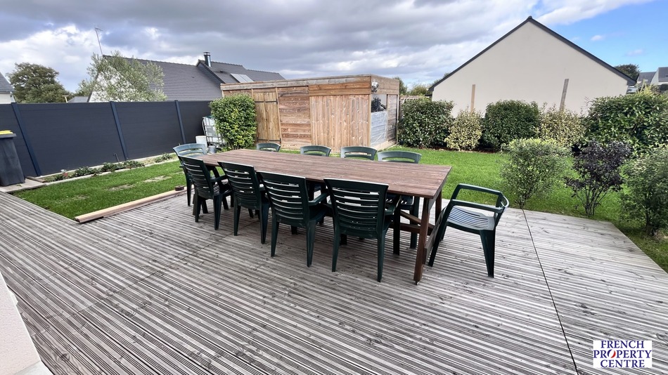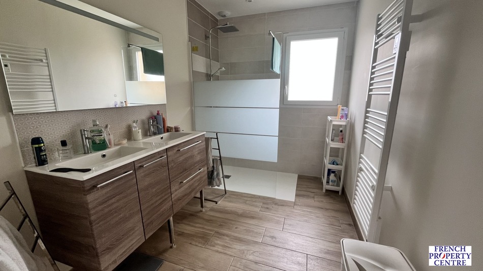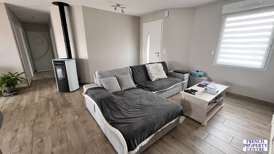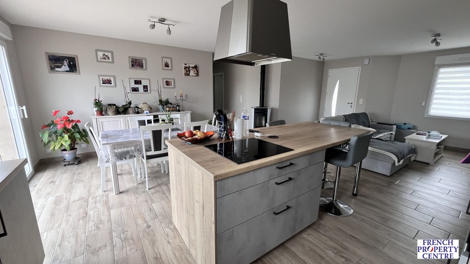 Découvrez cette magnifique maison plain-pied de 96 m², construite en 2022, alliant modernité et confort. Son espace de vie de 44 m² baigné de lumière naturelle est parfait pour les moments en famille ou entre amis : cuisine aménagée équipée ouverte sur un salon séjour avec un poêle à granulés.