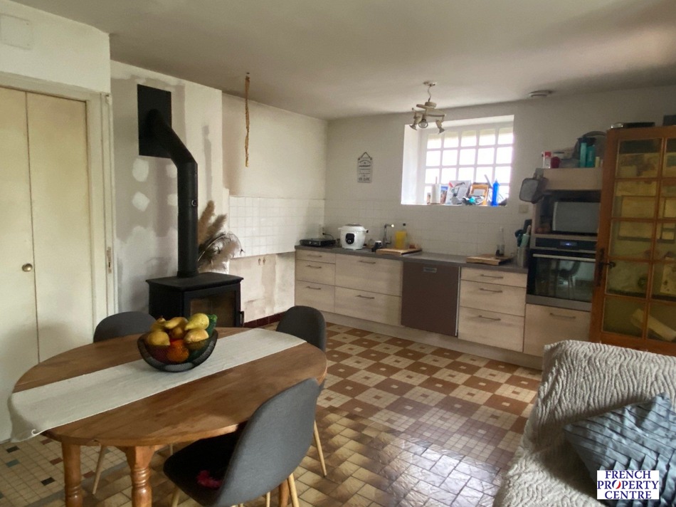 Plein centre-bourg, elle se compose au rez-de-chaussée d'une entrée, un séjour avec poêle à bois et cuisine ouverte non aménagée, WC, salle d'eau avec douche lavabo bidet, buanderie avec sortie extérieure.