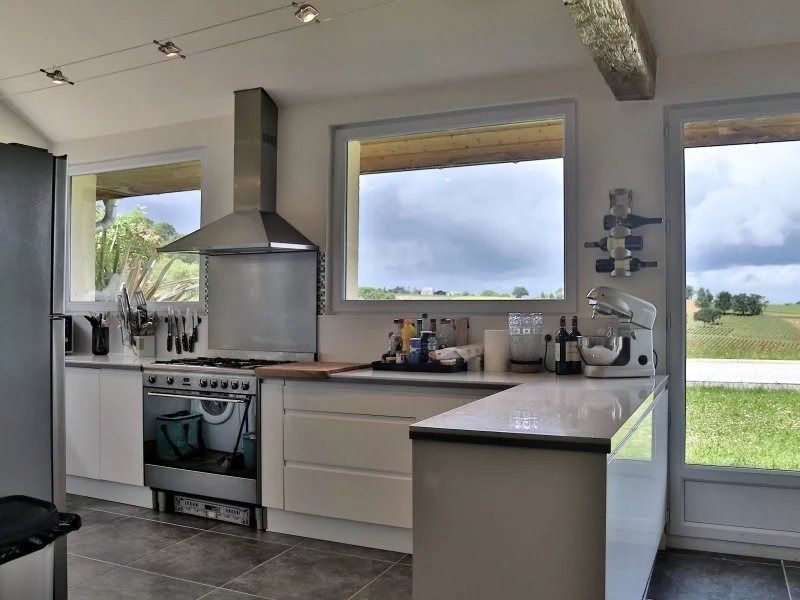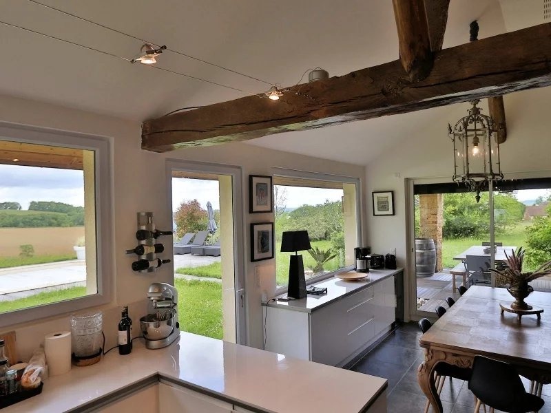 A spacious dining area spills off to the side of the kitchen and in turn opens onto a generous covered terrace with spectacular views over the rolling hills and vineyards of the Madiran region.