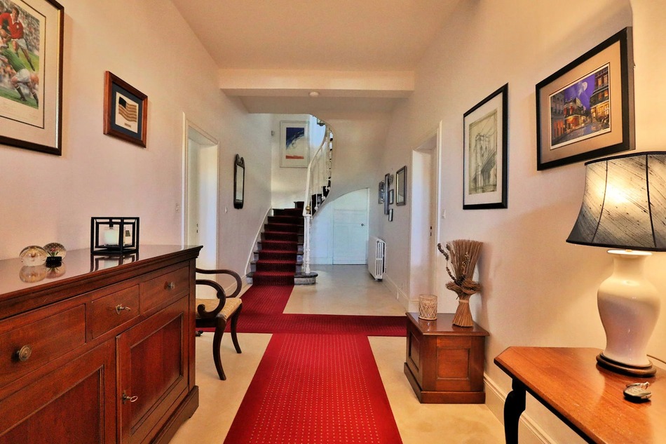 Élégante maison de ville. Élégante maison de ville située juste à côté de la place du village, avec un jardin en cour comprenant une piscine, une terrasse couverte et un garage accessible en voiture. Située au cœur d’un village bastide historique, elle se trouve à un peu plus d’une heure de Pau, 1 heure 10 minutes de Biarritz et 1 heure 20 minutes de Bordeaux. Les portails en fer forgé s’ouvrent sur une cour formelle entourée de murs et de haies de buis. Un chemin gravillonné mène à la porte d’entrée. Rez-de-chaussée Entrée : Sols en pierre crème avec un escalier courbé. Salon principal (60m²) : Fenêtres jumelles sur les façades sud-est et sud-ouest. Sols en pierre crème, cheminée en chêne encadrée d’étagères. Salle à manger (20m²) : Fenêtres jumelles orientées sud-est. Sol en damier noir et gris, cheminée en marbre. Cuisine (20m²) : Éléments intégrés, sols en terre cuite, cheminée en pierre, piano de cuisson professionnel. Portes vitrées ouvrant sur un chemin en pierre menant à la cour intérieure et à la piscine. Étage supérieur Palier : En longueur, avec parquet en bois naturel sur toute la surface. Chambre 1 (25m²) : Cheminée en marbre, fenêtres jumelles sur la façade sud-est, une fenêtre sur la façade sud-ouest. Chambre 2 (20m²) : Fenêtres jumelles sur la façade sud-est, cheminée en marbre gris clair sculpté, placards intégrés. Passage communicant. Suite parentale (25m²) : Vue sur la cour. La chambre mène à une salle de bain avec double vasque, baignoire, douche à l’italienne et WC. Une porte mène à une buanderie, qui s’ouvre sur un passage reliant le grenier et l’escalier arrière. Chambre d’amis avec salle d’eau attenante. Partie arrière Un passage depuis l’espace de vie mène à : Chaufferie Cave à vin Bureau professionnel (deux pièces et un espace d’accueil) Un second escalier mène à l’étage supérieur, offrant un accès au grenier et aux chambres. Extérieur Le terrain s’étend sur environ 940m². Une entrée arrière s’ouvre sur une cour privée en gravier avec accès au garage. La cour engazonnée comprend une piscine carrée de 6m x 6m, carrelée en mosaïque beige, apportant une ambiance toscane. À côté de la piscine, une terrasse couverte dispose d’un espace barbecue et de nombreux sièges pour recevoir.