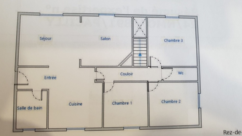 cuisine aménagée, séjour-salon avec cheminée, trois chambres, salle de bains avec douche, wc