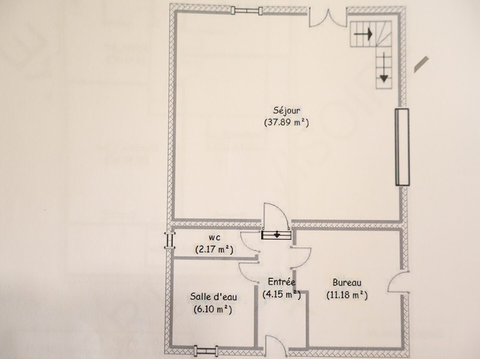 Au rdc : cuisine-séjour avec cheminée, bureau, salle d'eau, wc