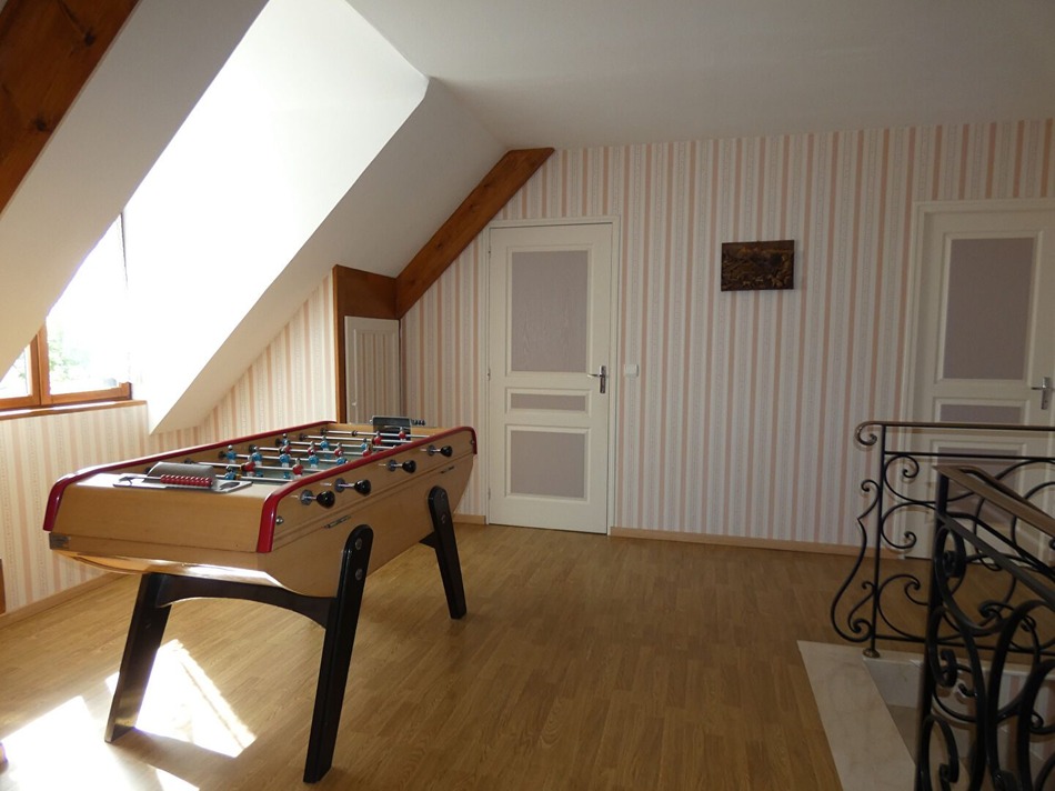 - Au 1er étage : mezzanine, deux chambres plus une avec une pièce communicante à terminer, salle d'eau, wc