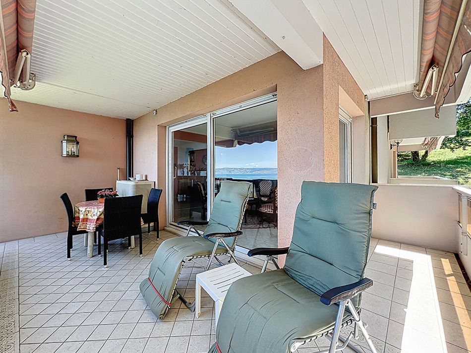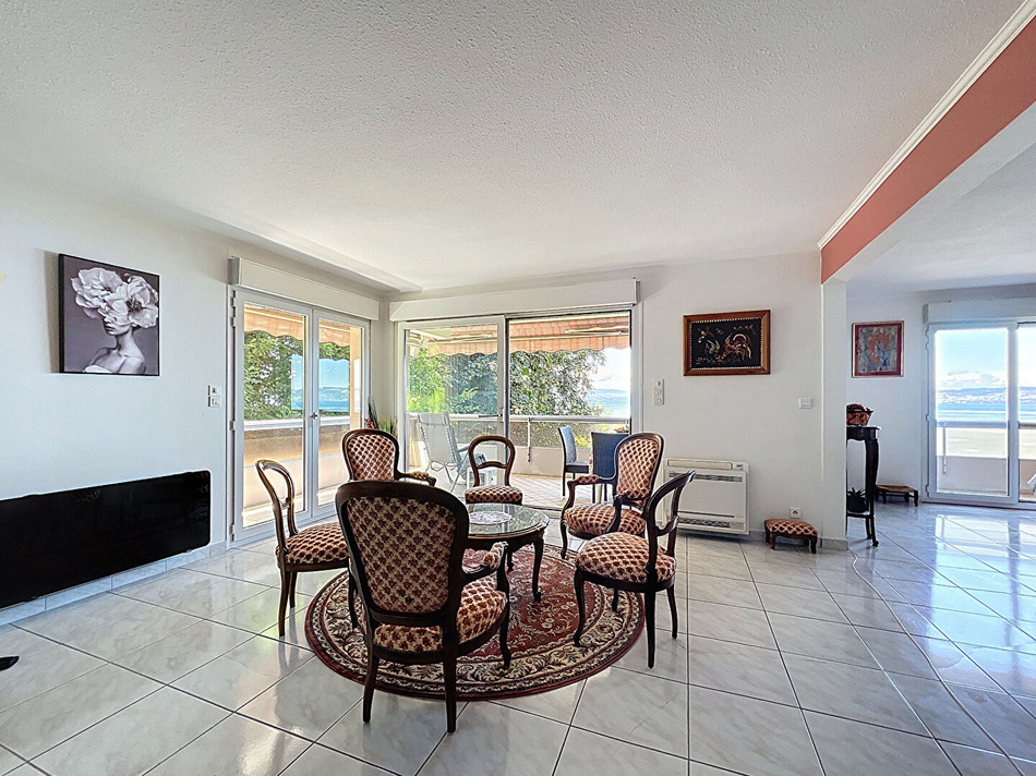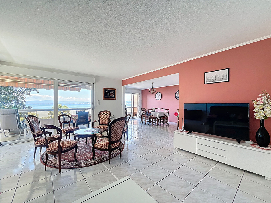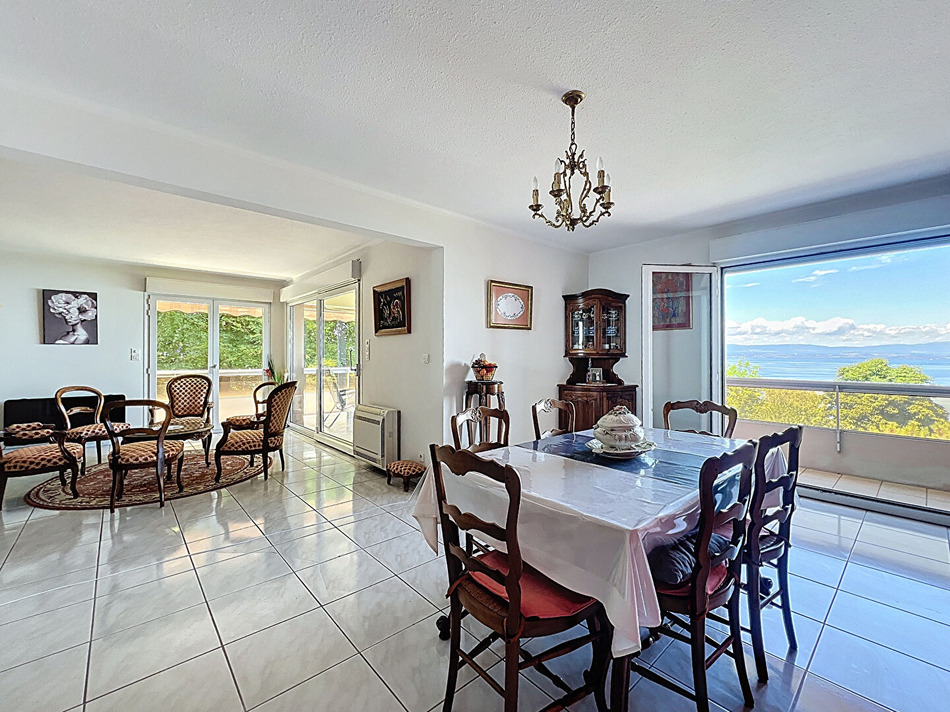 Cet élégant appartement se trouve au sein d'une résidence de standing prisée pour son calme et son environnement verdoyant. Idéalement situé à proximité du centre-ville d'Évian , des thermes... Vous serez immédiatement séduit par la vue parfaite sur le lac Léman, que vous pourrez admirer depuis la spacieuse pièce de vie de 30 m2 baignée de lumière grâce à ses grandes baies vitrées. Cette pièce réunie la salle à manger et le séjour convivial ,donnant accès à la terrasse ombragée, entourée de verdure, idéale pour vos moments de détente. La cuisine est séparée, équipée et aménagée et de belle dimension, elle vous fera apprécier les repas familiaux ou entre amis. Côté nuit, deux belles chambres dont une avec placards vous accueillent ,les deux salles d'eau et deux WC apportent une véritable commodité supplémentaire. Pour parfaire ce bien, un garage fermé et une cave sont inclus. Un cadre de vie privilégié, entre lac et ville, au coeur d'un environnement naturel préservé.