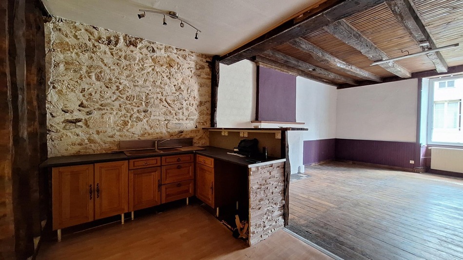 Maison de bourg comprenant au rez-de-chaussée garage d'environ 92m², une pièce pouvant servir de chambre, accès au jardinet. A l'étage, pièce de vie avec coin cuisine aménagée, deux chambres, une pièce de passage, salle d'eau et WC. Grenier au-dessus. Cave.Toiture récente, menuiseries double vitrage, tout à l'égout. Les informations sur les risques auxquels ce bien est exposé sont disponibles sur le site Géorisques: www.georisques.gouv.fr