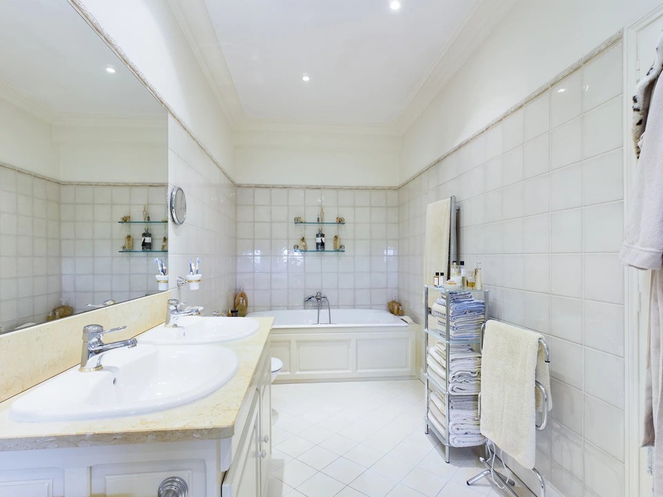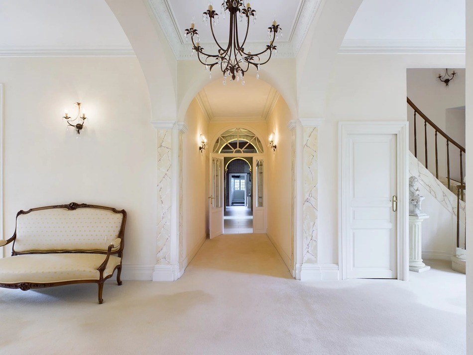 From the moment you enter through the traditional entrance hall, natural light pours in through French doors, illuminating the refined interiors. To one side, a formal dining room invites convivial gatherings; to the other, a gracious drawing room offers classic charm. The south-facing kitchen is a true highlight—modern, bright, and wonderfully inviting.
