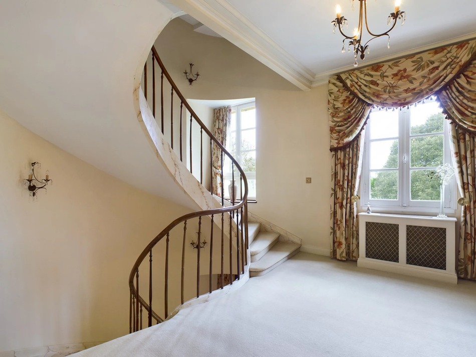 The home’s standout feature is a dramatic TV room with soaring vaulted ceilings, exposed oak beams, and a mezzanine level—a space that balances grandeur and comfort. Additional ground floor amenities include a cosy snug, a private study, a hobby room (currently housing an intricate model train collection), a spacious utility room, a cloakroom, and access to generous wine cellars.