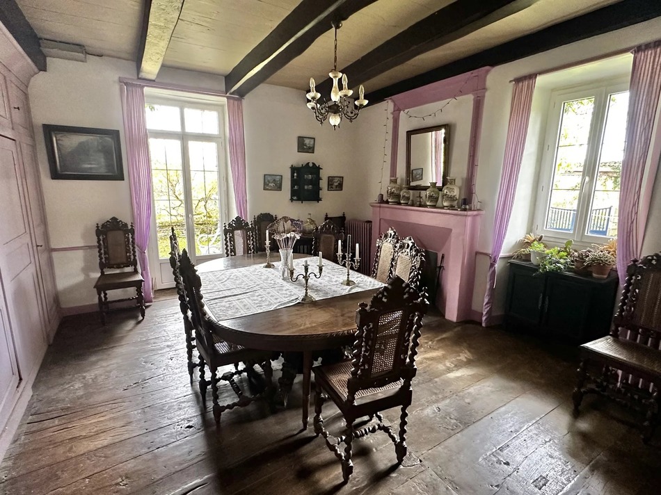 Reached via a long private, tree-lined driveway, the main house (229 m²) offers generous living spaces filled with period character, exposed beams, stone walls, original floors and grand fireplaces.