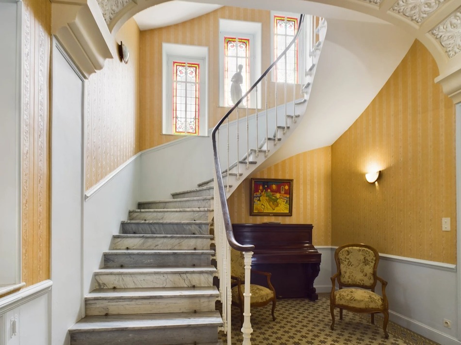 Come and discover this impressive château built in 1907, which has retained many of its original features. Accommodation comprises 11 bedrooms, 8 of which are en-suite. Your visit begins as you walk through the landscaped gardens to the superb entrance hall, where you can admire the decorative glass windows! The ground floor offers a living space with a sun room featuring a feature window, leading to the large dining room with direct access to the terrace offering magnificent garden views.