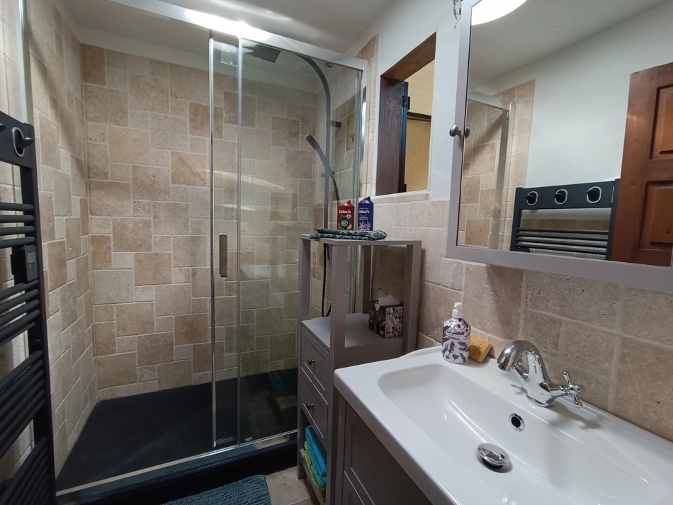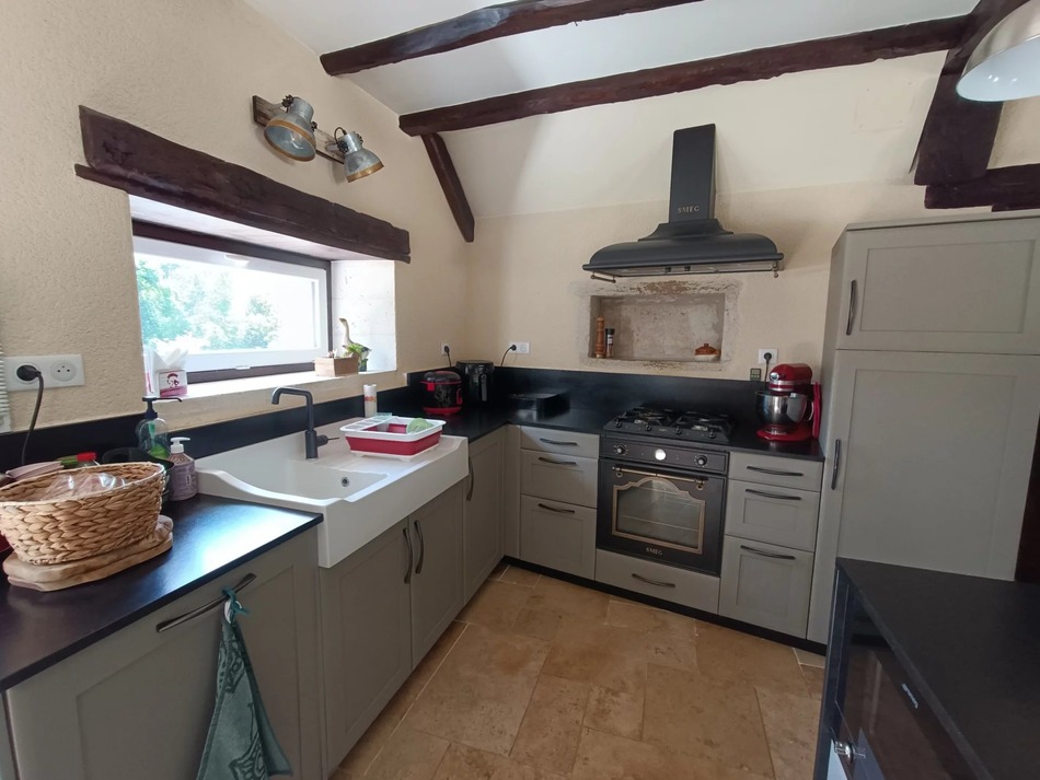 The mill has been fitted out on two levels. On the ground floor, it consists of a spacious living room with its designer wood-burning stove and a fully equipped kitchen area. Linking through to the living room, an office has been fitted out with its wood stove and could easily have another use depending on the buyer's needs. In addition, a master suite with its own shower room and WC has been fitted out with direct access to the outside and the mill park. A laundry room completes the ground floor.