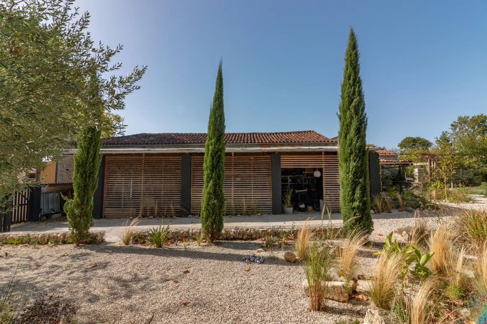 To the front of the house is a prettily landscaped Mediterranean-style garden, to one side of which is a covered terrace - perfect for outdoor entertainment / relaxation. Next to this is a large storage outbuilding. The land wraps around the house, with the garden to the rear being mainly left to lawn.