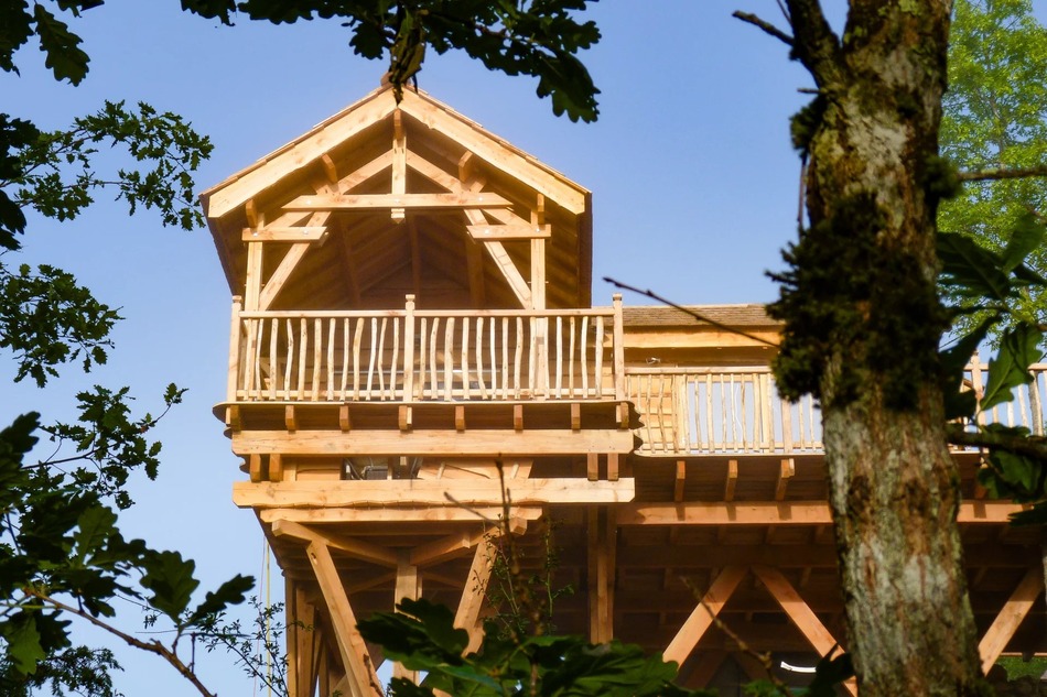The first is an architect-designed luxury treehouse. Blending adventure with comfort, it offers a private terrace suspended among the trees and a hot tub overlooking peaceful woodland, creating a romantic and unforgettable experience.