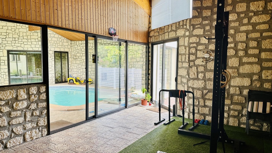 The house has an indoor gym, sauna and heated indoor swimming pool, with underfloor heating, automatic roof windows and sliding doors leading to the rear or front terrace of the property, where you can barbecue or relax with family and friends.