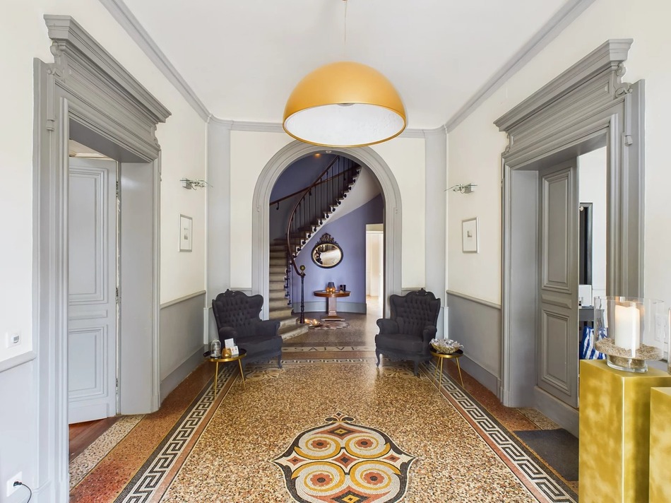 You enter into the chateau's princely hall with fine mosaic floors and sweeping staircase from which the reception rooms fan out.