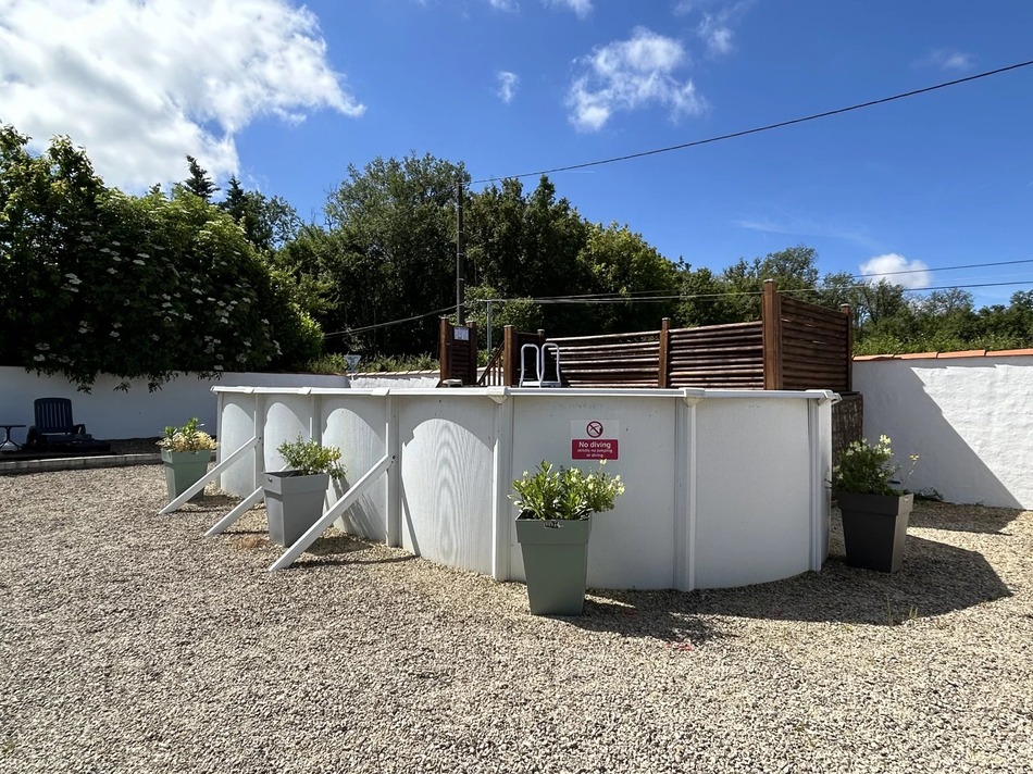 In addition across the gravelled courtyard is an office/ reception area with two covered terraces, a laundry room with washing machines, fridge and freezers for guests and campers plus a shower room with W,C and washing up sinks for campers offers sinks and chemical toilet emptying point. Beyond this the above ground pool which has a large decking area for sun loungers and mini bar for evenings around the pool.