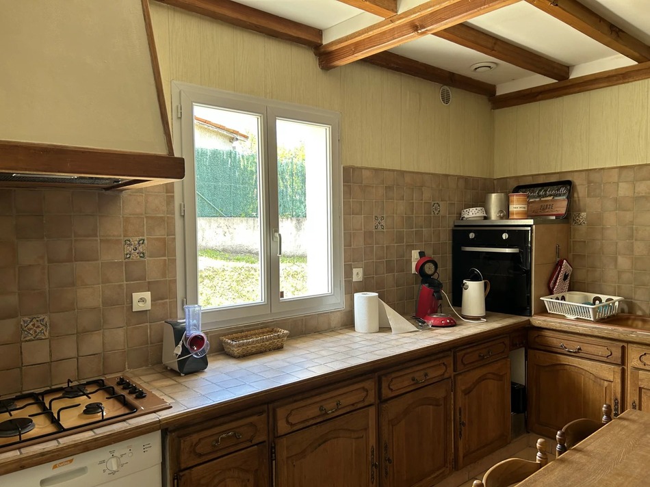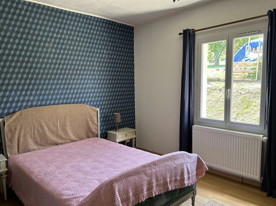 Situated at the end of the driveway, away from the town's traffic and noise, this charming bungalow sits proud on a well maintained garden, overlooking the city of Riberac. The well sized pool has a hard cover to allow swimming all year round.