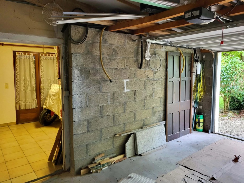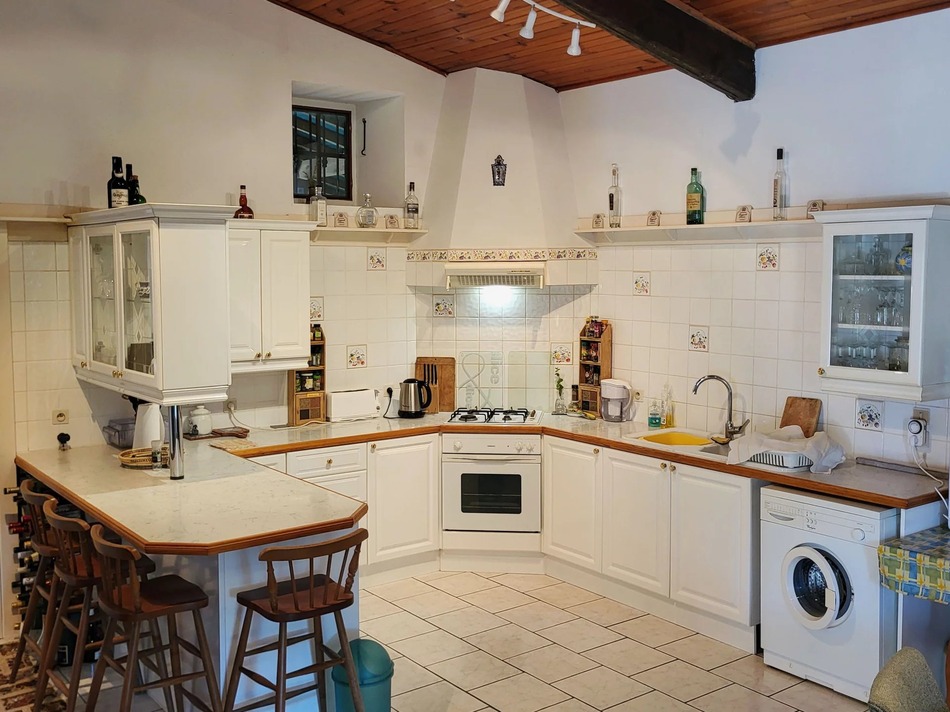 You enter into the heart of the home, a large, vaulted kitchen dining area, with stairs leading to the upper floor and two doorways leading into a light and airy lounge with a traditional stone Charentais fireplace. Behind the kitchen lie a bathroom, a separate WC and the entrance to one of two garages, and a workshop beyond, currently housing the gas boiler.