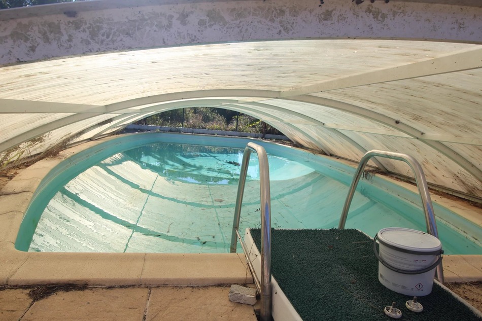 The pool at the front of the property has a retractable cover and was fitted with new pump and filters in 2023. At the rear of the plot is a separate entrance, plus a paddock field and small wood.