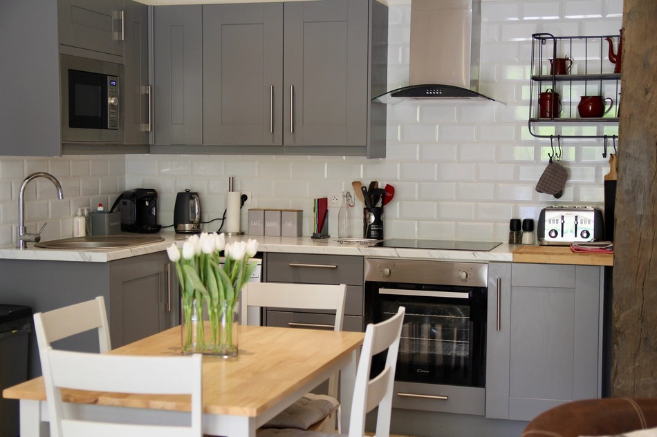 The house comprises an entrance hall and a cloakroom, a stunning shaker style kitchen with granite worktops, kitchen island and separate utility room. The comfortable dining room has a fireplace with a log burning stove which leads up a step into the living room. Two bedrooms and a bathroom with roll top bath are on the ground floor and upstairs a master suite with dressing area and en-suite shower room.