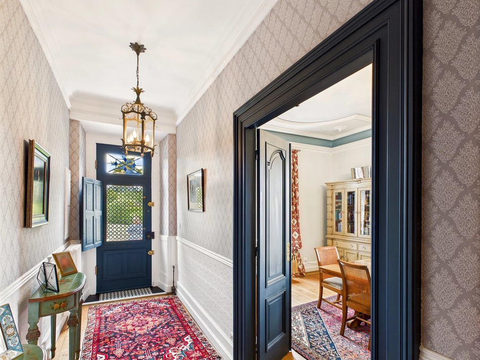 From the driveway, you enter the main floor, which reveals a graceful, classical entrance hall, a spacious living room, a dining room, a fully equipped kitchen with central island, and two bedrooms, each with its own walk-in closet.