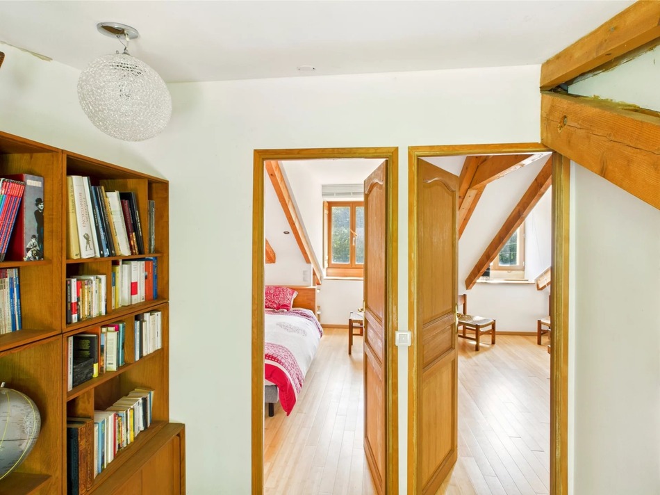 The main house offers a spacious entrance hall leading to a pantry and kitchen, which opens out onto a charming covered terrace—ideal for al fresco dining. The generous living room features a striking open fireplace, original beamed ceilings, and multiple French doors opening to the garden, filling the space with light and character.