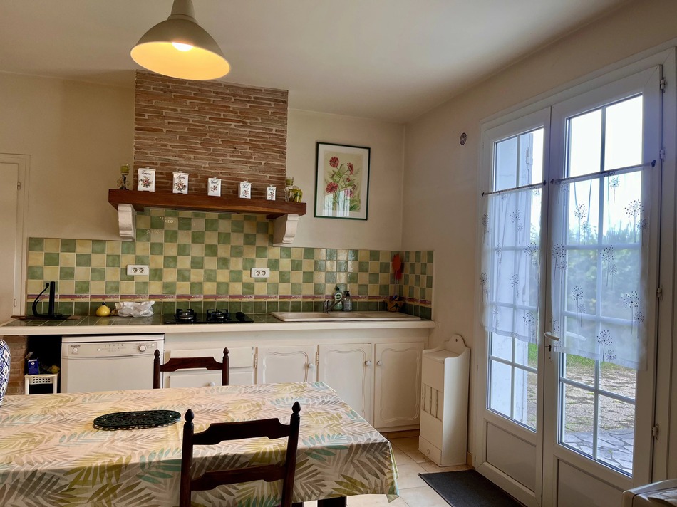 Set on a spacious 1000m² plot, this property includes three bedrooms, a kitchen, a comfortable living room with wood burner, a bathroom, and a separate WC. There is an adjoining garage, housing the boiler and a sink.