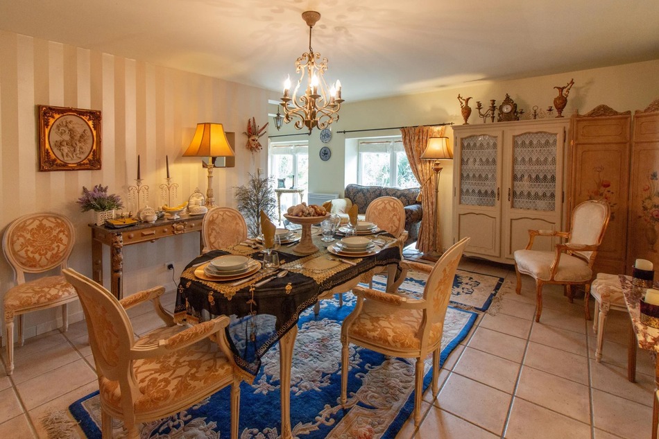 At the rear of the house is a large parking area and a covered terrace with main door to the entrance hall. The hall also has a glazed front-door to the garden. To the right of the hall is a bed-sitting room with fireplace - this leads on to an inner hall with WC, shower room and a fully fitted eat-in kitchen. To the left of the hall is a large drawing with wood burning stove - this leads on to a separate dining room which in turn leads on to a fully fitted kitchen. Off the kitchen is a utility room, WC and a snug with french doors to the garden.