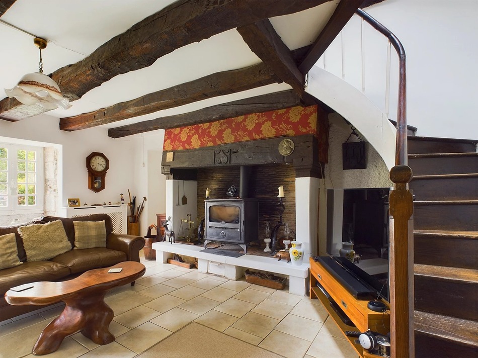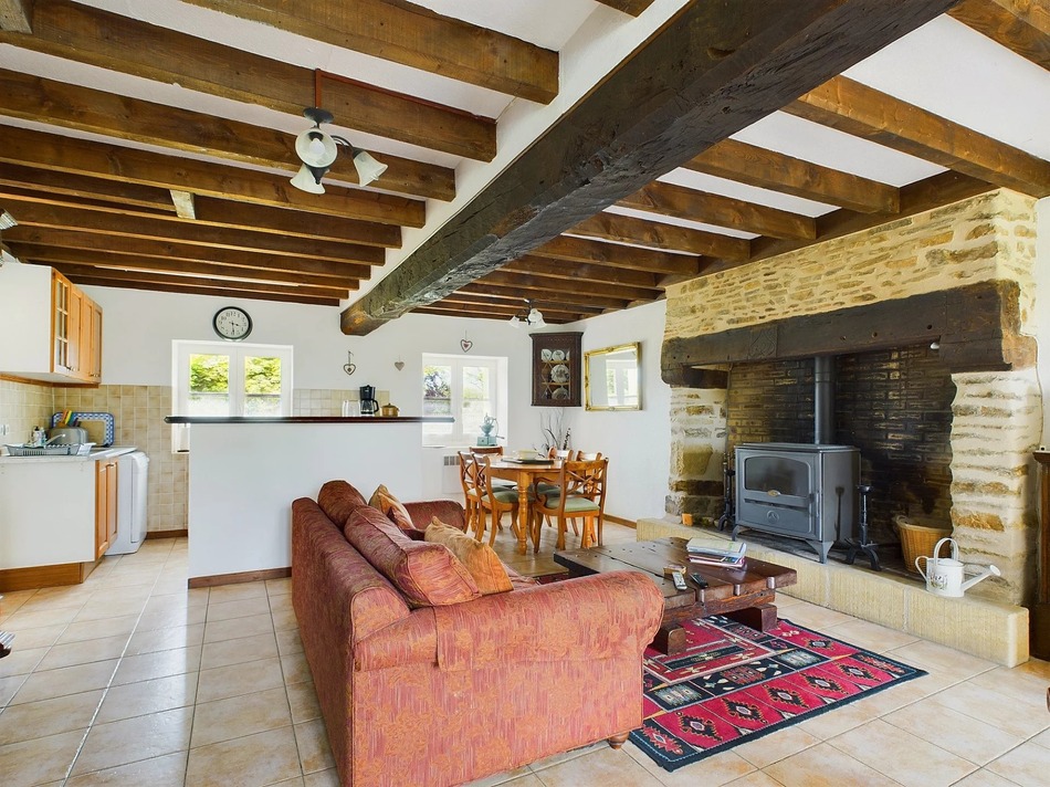 On the ground floor, you enter into a spacious open-plan kitchen, dining, and living area with a large fireplace and log burner creating a warm and inviting atmosphere, perfect for both everyday family living and entertaining guests. A shower room with WC is also located on this floor.