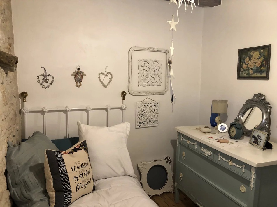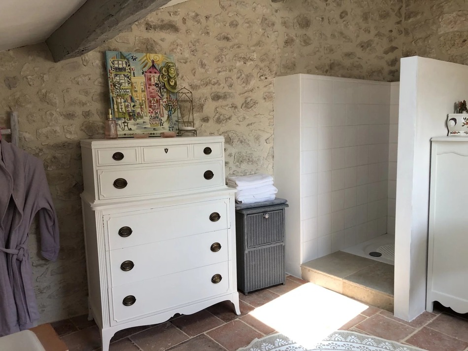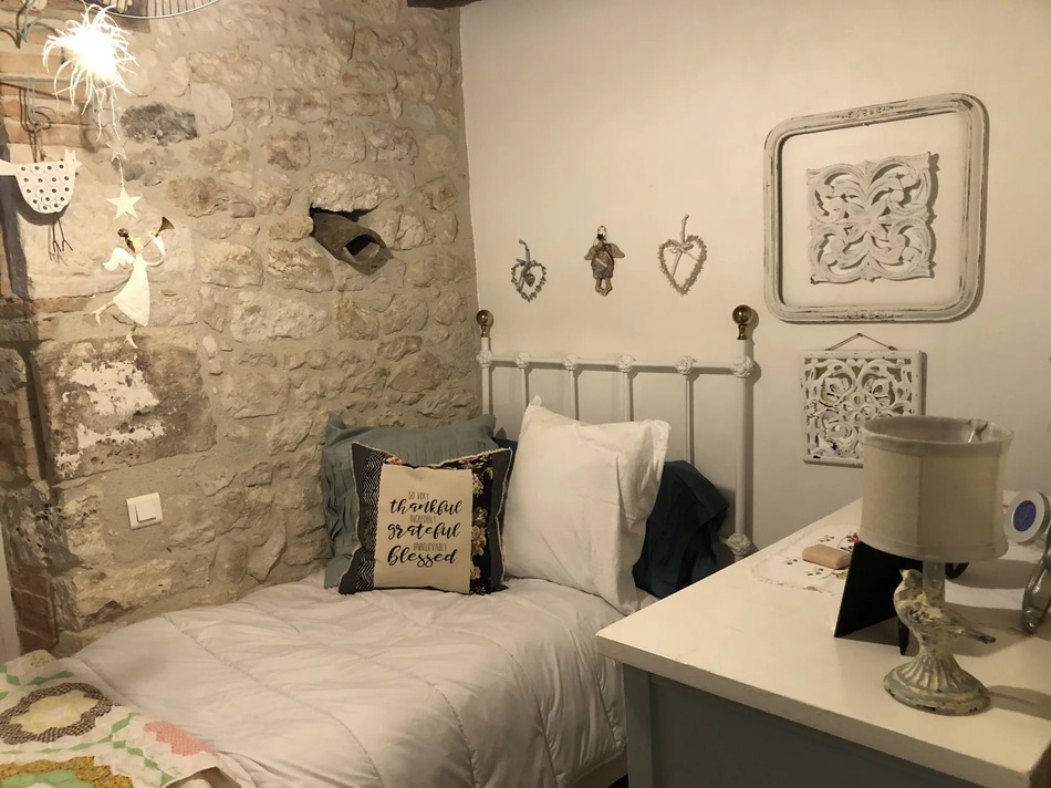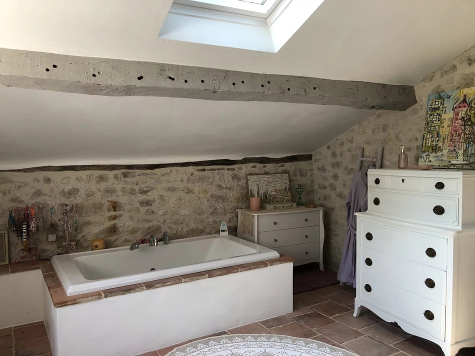 This lovely stone cottage packed with character and personality is in a beautiful village surrounded by countryside and has a great entertaining kitchen/ dining/ living room with wood burner. From here you can walk out onto a secluded terrace with covered outdoor kitchen. It has a hobby room/study, laundry room and an additional room currently used for storage that with the required permissions could be used as a separate rentable space with its own private entrance. There is also a WC on this level. Taking the stairs to the upper level is a hallway leading to three bedrooms and a large bathroom with over-sized tub, double sinks and separate shower.