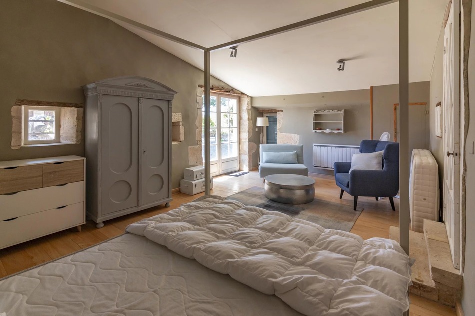 The main house offers a large living room, an equally large kitchen, downstairs WC and a store room. Upstairs a landing gives access to a vast triple-aspect master bedroom with en suite bathroom. In addition to this there are two further double bedrooms, a shower room and an office/bedroom with mezzanine. Below the house is a cellar – perfect for storage or for use as a wine cellar.
