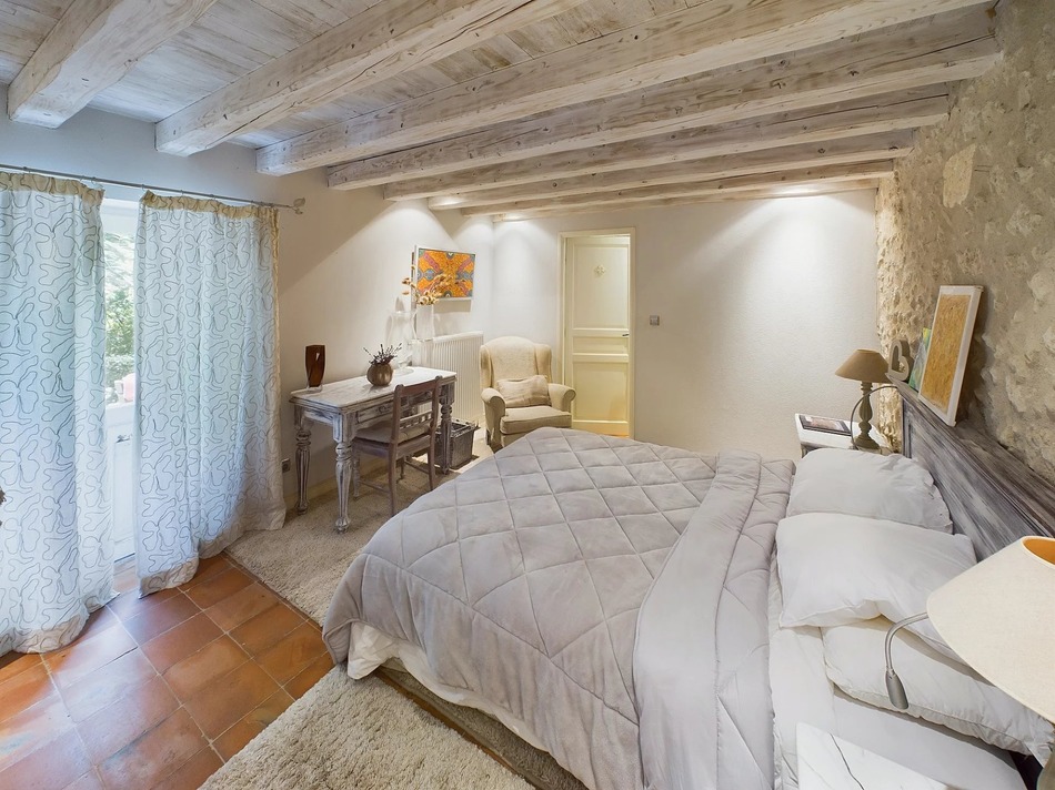 Across the bridge with its ironwork balustrade is the luxury guest accommodation comprising three 1-bedroom apartments. With one self-contained suite on each of the three floors, they have been carefully designed to offer maximum privacy. The apartments offer high-end comfort, private terraces overlooking the river, swimming pool, and barbeque areas. The ground floor apartment is also wheelchair and mobility friendly.