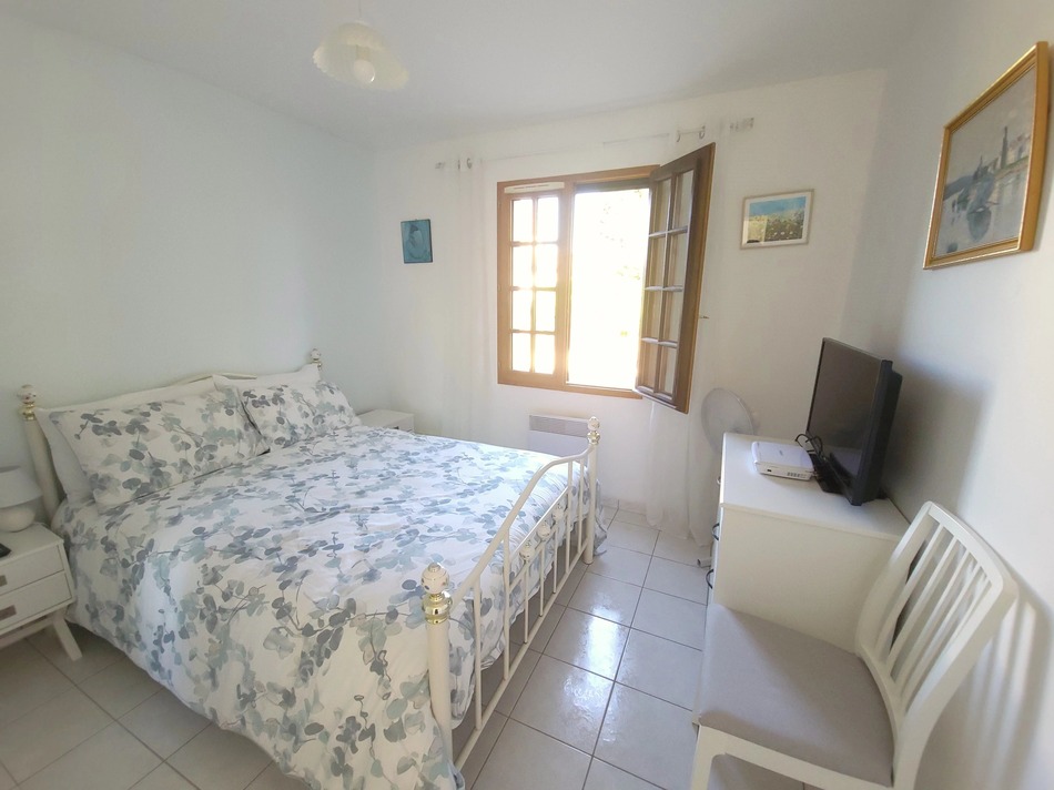 Two of the bedrooms lead directly out to the garden and, along with the first floor space, currently used as a bedroom, have the luxury of air conditioning. The eat-in kitchen and living room are bright and airy with dual-aspect windows and access to the large, South-facing terrace. The terrace has some shade incorporated and a there is lovely in-ground pool with its own enclosed terrace overlooking the fields.