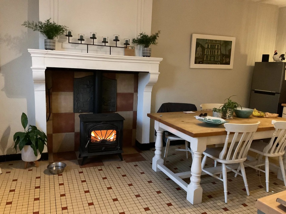 Inside, the home unfolds with versatility and charm. A welcoming salon with a feature fireplace sets the tone, flowing into an adjoining room ideal as a playroom or study, complete with a spiral staircase ascending to a generous master bedroom with its own ensuite shower room and WC. At the heart of the home lies a spacious kitchen, another fireplace lending warmth to family meals, while a hallway leads down to the cellar — perfect for storing preserves or autumn wines.