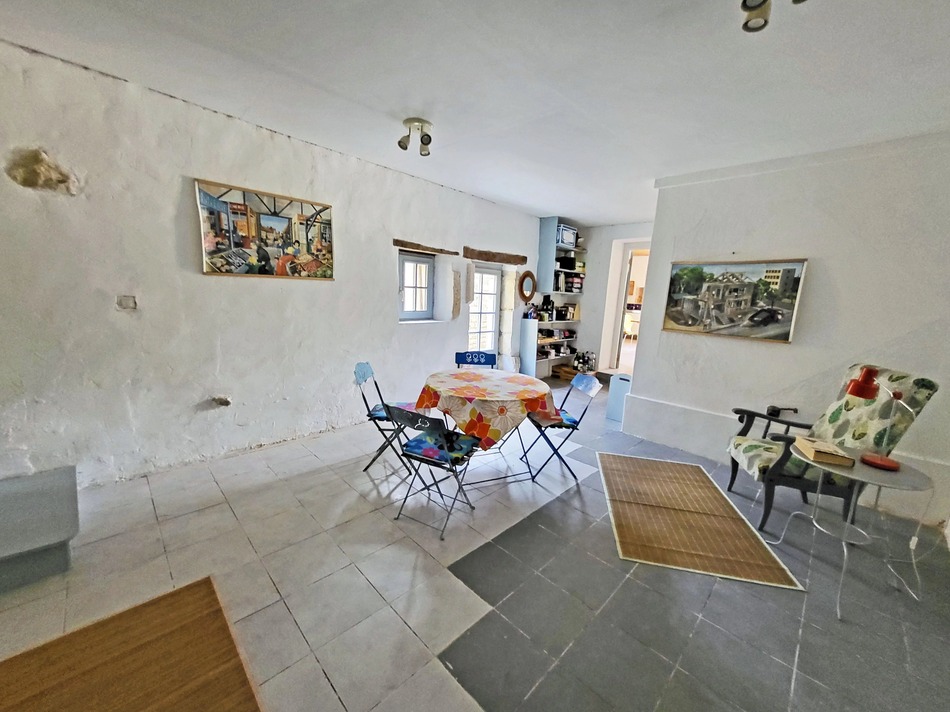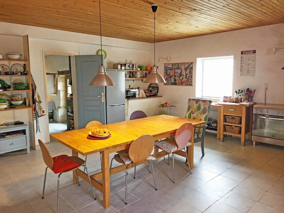 On the ground floor the large kitchen dining area, which opens on to the south-west facing garden, leads through to the cosy, double aspect, living room (also overlooking the garden) with wood-burning stove, and, from its rear to the workshop and storage area, which also serves as a back kitchen. From here, one can access the laundry room, downstairs bedroom, shower, garage and an additional small courtyard, very useful for drying clothes. There are two staircases, offering the possibility of splitting an already very large property into two, for the purposes of additional income through gite rental (subject to necessary permissions). The first takes you from the living room to a landing from which there is access to two more bedrooms, one of which has more stairs leading to a mezzanine area currently used for storage, a walk-in wardrobe, bathroom and WC. From this landing, there is a doorway to the most spectacular of rooms with stone walls and vast, vaulted ceiling, perfect for entertaining on those long, hot summer evenings. To the rear of this room is another landing, leading to the fourth bedroom and the second staircase, bringing you down into the rear of the property.