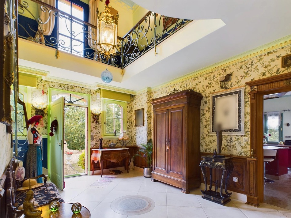 The main house offers an exceptional atmosphere. On the ground floor, there is an entrance hall with a double-height ornamental ceiling with gallery and tailor-made hanging lantern (Louis XV style). There is a separate kitchen, dining room (with underfloor heating) and living room with fireplace, stylish office, laundry with bathroom, WC and a double garage access. A magnificent terrace overlooks a cinematographic landscape featuring special items, including a piano renovated with mosaic tiles.