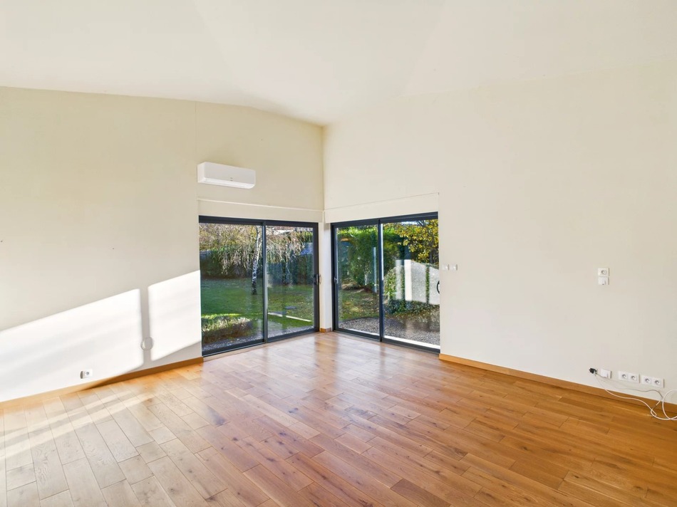 The spacious lounge is bathed in natural light thanks to large picture windows and glass sliding doors that open directly to the garden, creating a seamless connection between the indoor and outdoor living. Quality finishes include partly real wood parquet flooring and a built-in wardrobe.