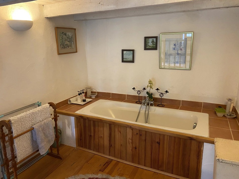 This charming stone house, complete with an adjoining barn and gardens, is located in a peaceful hamlet. It has two double bedrooms and two bathrooms, one of which is particularly special, featuring a bath on the mezzanine.