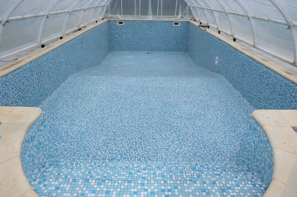 Expansive 12-meter tiled pool with a summer kitchen and terrace for poolside relaxation and entertaining.