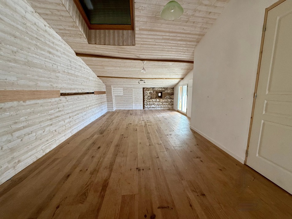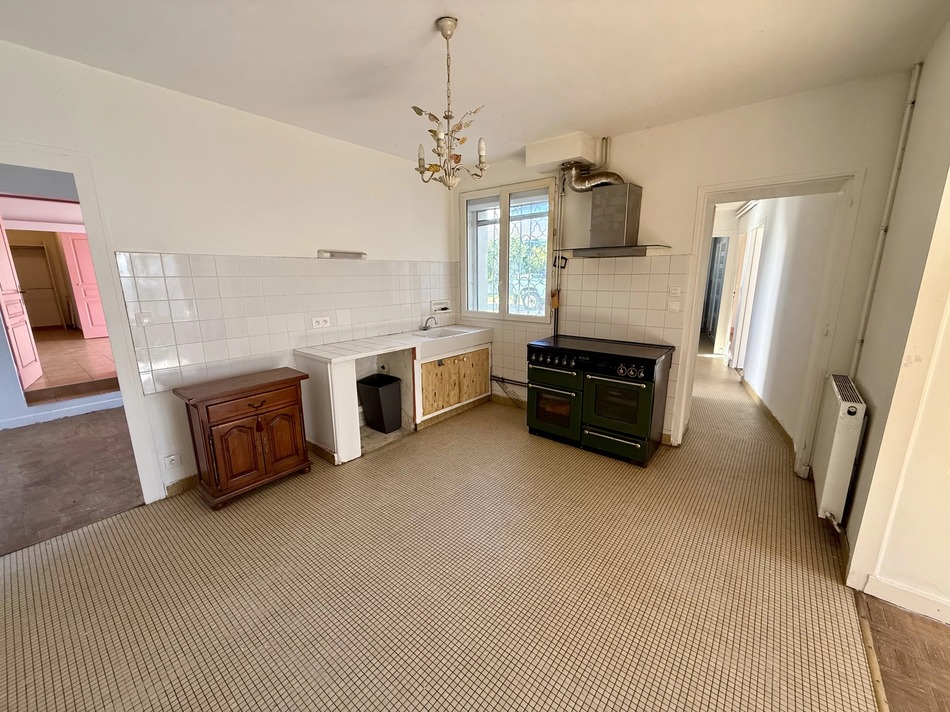 The ground floor features a spacious kitchen-dining area, to be redone entirely, as well as a main bedroom with dressing room and several additional living spaces ready to be reimagined. The floors, walls, and joinery would benefit from decorative updates, but the structure and volumes offer strong potential to create a bright, welcoming interior.